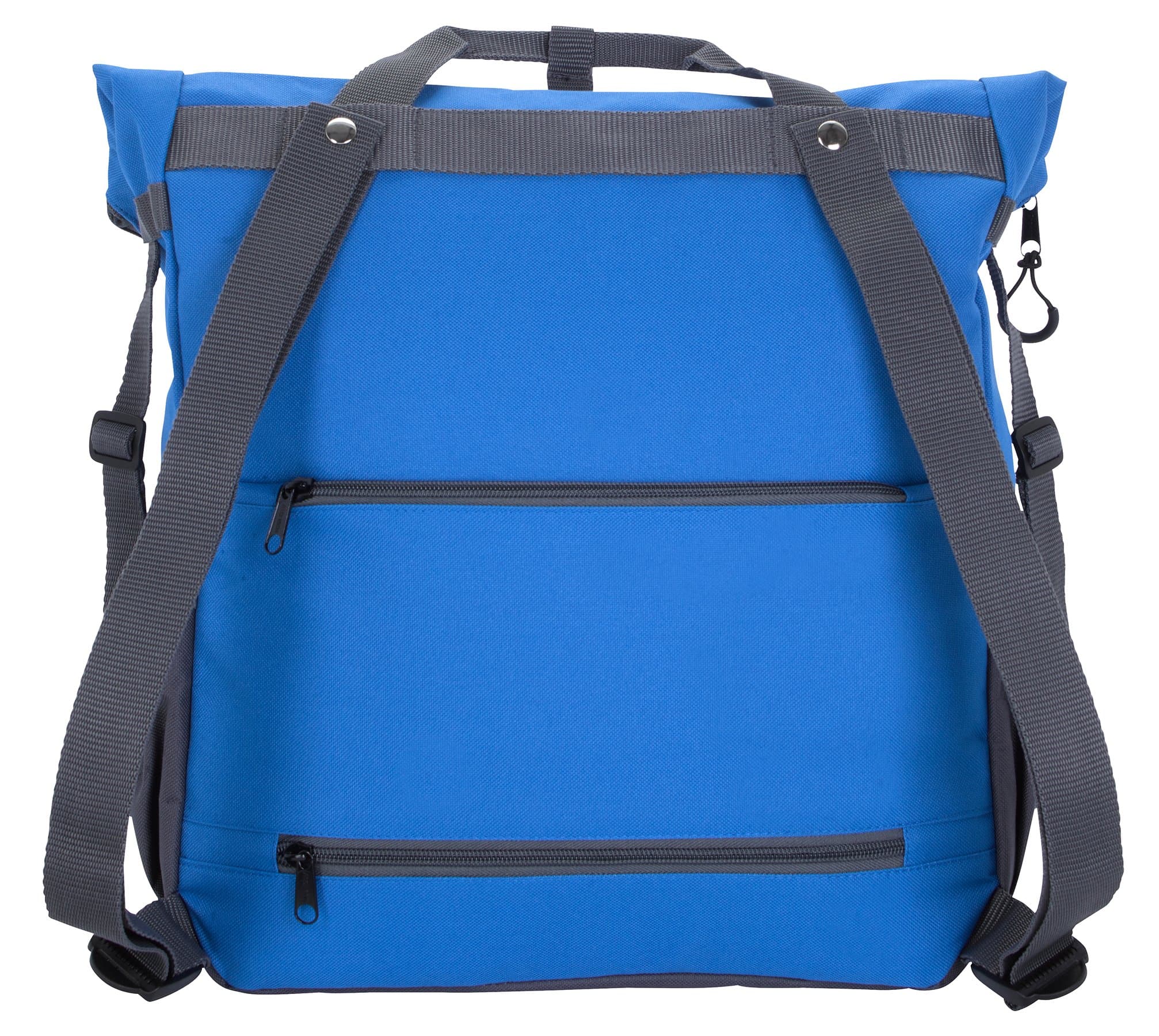 Easily transport your items your way with this adaptive tote-pack! Made from RPET materials, it includes easy-pull O-ring zipper pulls, multiple front pockets for better organization and easy access, adjustable back straps that allow you to use it as a backpack, and adjustable adaptive straps for easy attachment to any kind of chair. Additional features include two side zippered pockets, daisy chains for additional attachments, compression straps at the sides, interior padded laptop and tablet sleeves, a fully padded backside, and straps with loops for attachments. 13.1875″ W x 15″ H x 4.75″ D