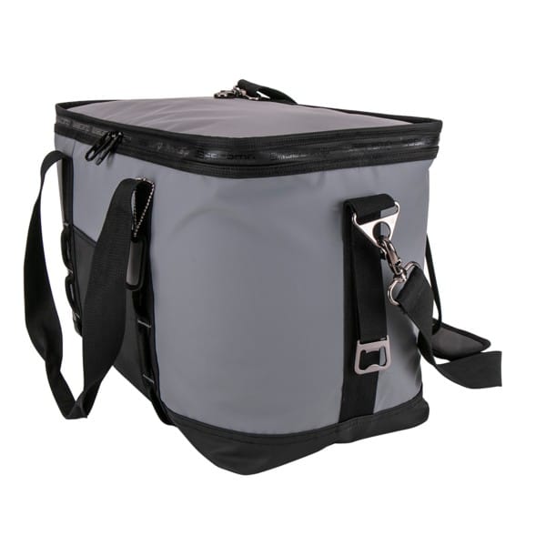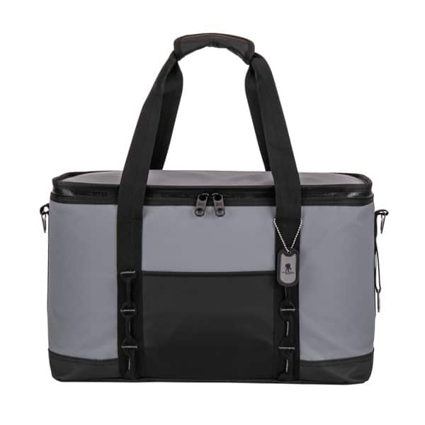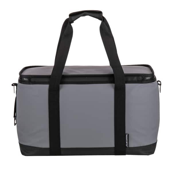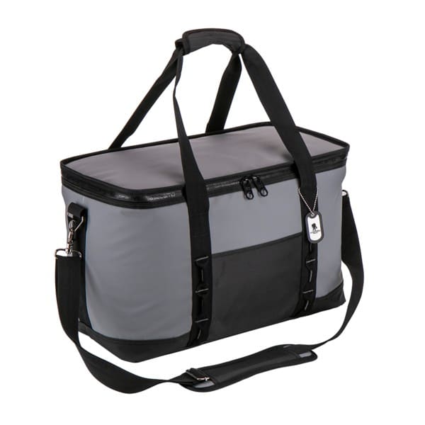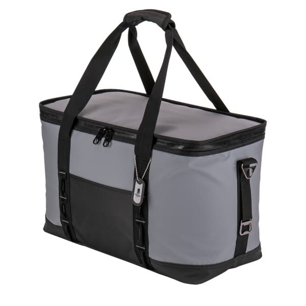 Water-resistant tarpaulin cooler bag with thick foam padding insulation. Features a zip around wide top opening with a water-resistant ghosted Basecamp printed zipper; 420D polyester front open pocket; double webbing straps, with hook and loop wrap handle; attached gunmetal bottle opener and hardware; adjustable shoulder strap that extends to bottom for increased durability, with ergonomic shoulder pad with slip guard underneath; 36 can capacity; includes decorative Basecamp dog tag. 19″ W x 9.5″ L x 11.5″ H
