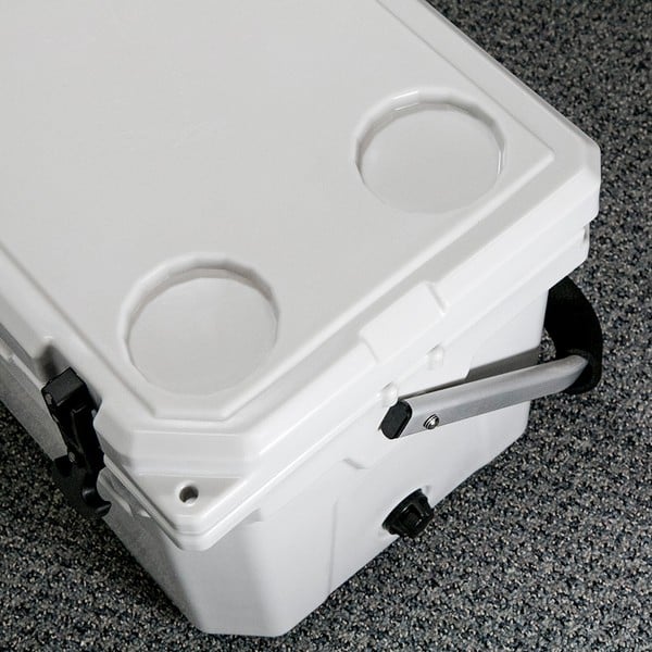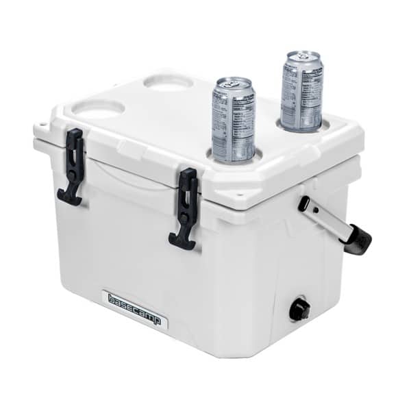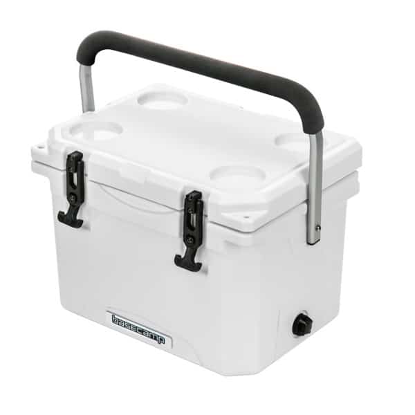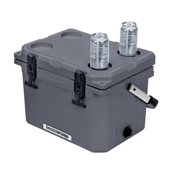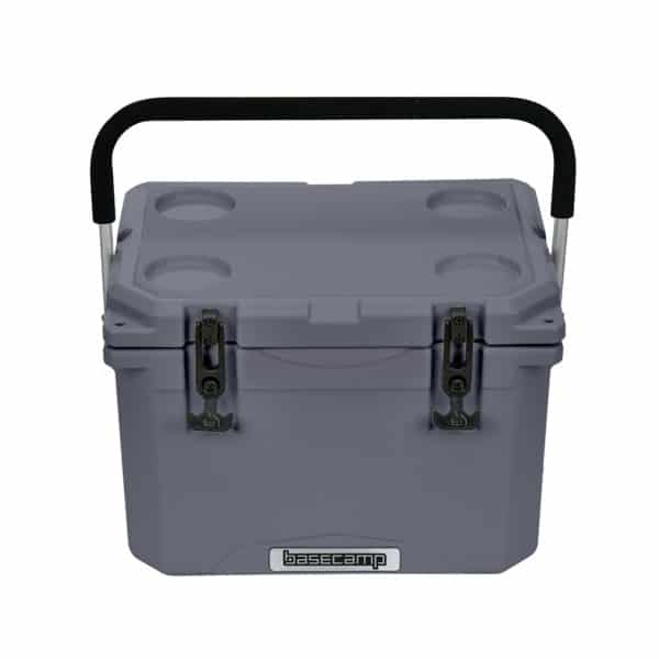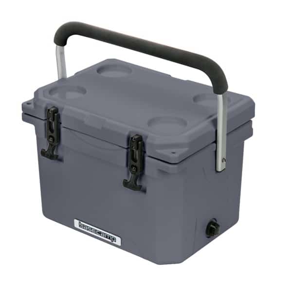 Meet the Basecamp Ice Block 20 Cooler. Roto-Molded to produce the highest quality product possible, the Ice Block 20 contains twice the insulation of a typical ice chest. The end result is a water tight cooler that holds ice solid for days and days. This 20L cooler features a cup-holder lid for four, a padded carrying handle for easy transportation, rubber lug latches for security with additional padlock points for creature-proofing, and a convenient drain port for easy clean up. 19.7″ D x 13.4″ H x 15.333333″ W