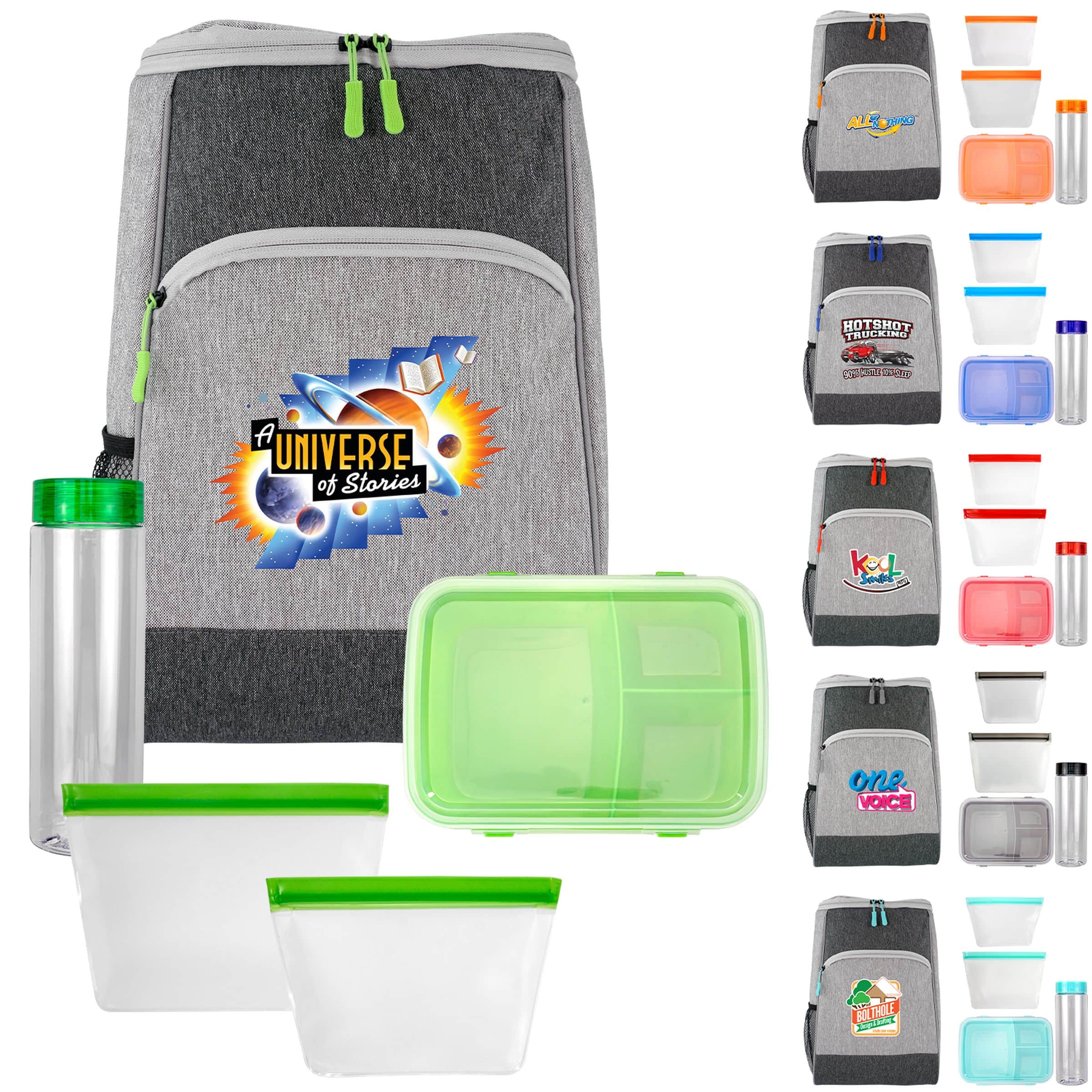 Introducing the Bay Cooler Backpack, designed with a convenient full-top opening for easy access. The Lunch To Go Container features a secure clip top, perfect for keeping your meals fresh on the go. Stay hydrated with the Clear View 24 oz. Bottle, ensuring you never run out of water. For a sustainable option, the Reusable Food Storage Bag Set is the perfect solution for storing your snacks and meals. Experience convenience and organization with these essential items for your daily routine. Complies with FDA, Prop 65. 10.25″ L x 5.5″ W x 15.5″ H
