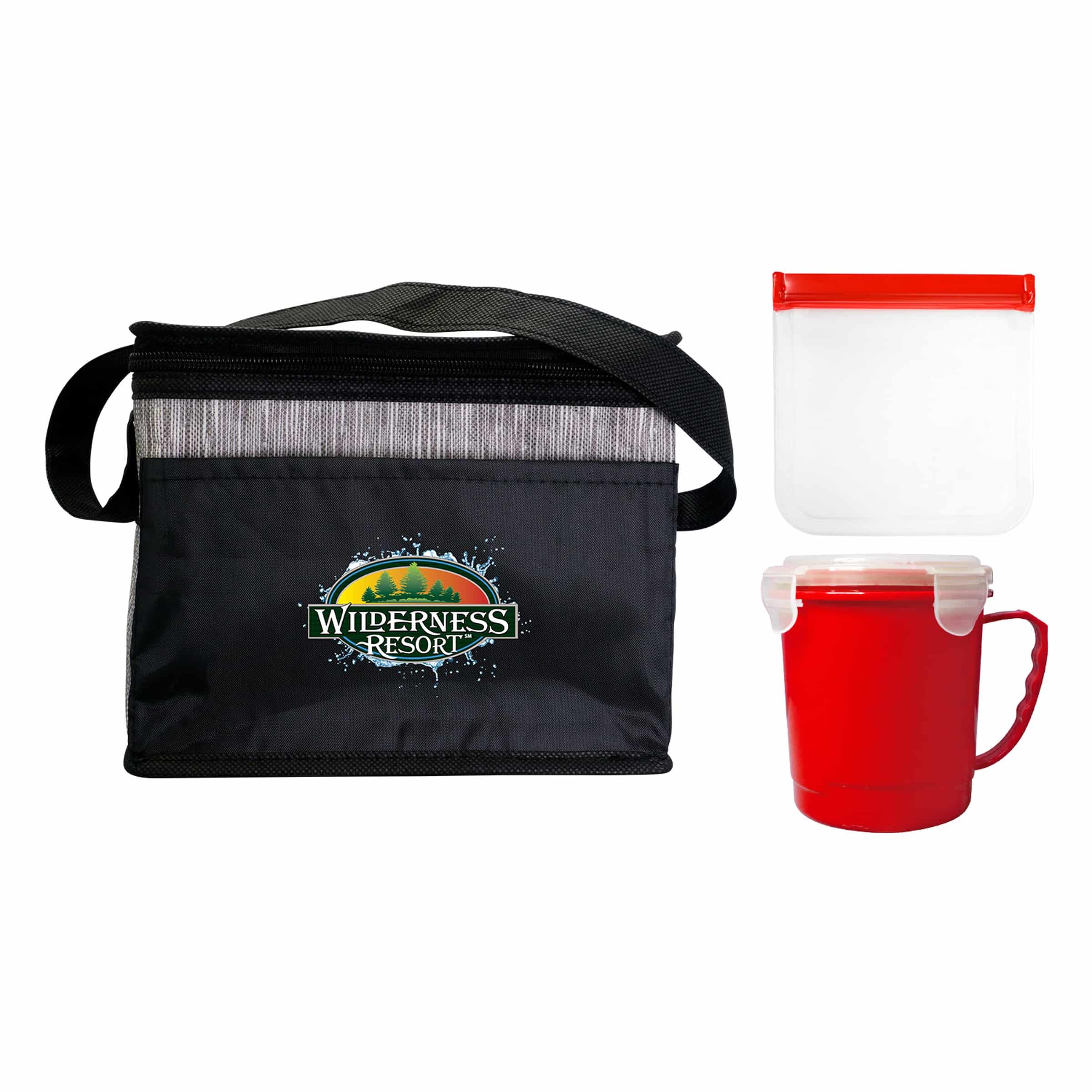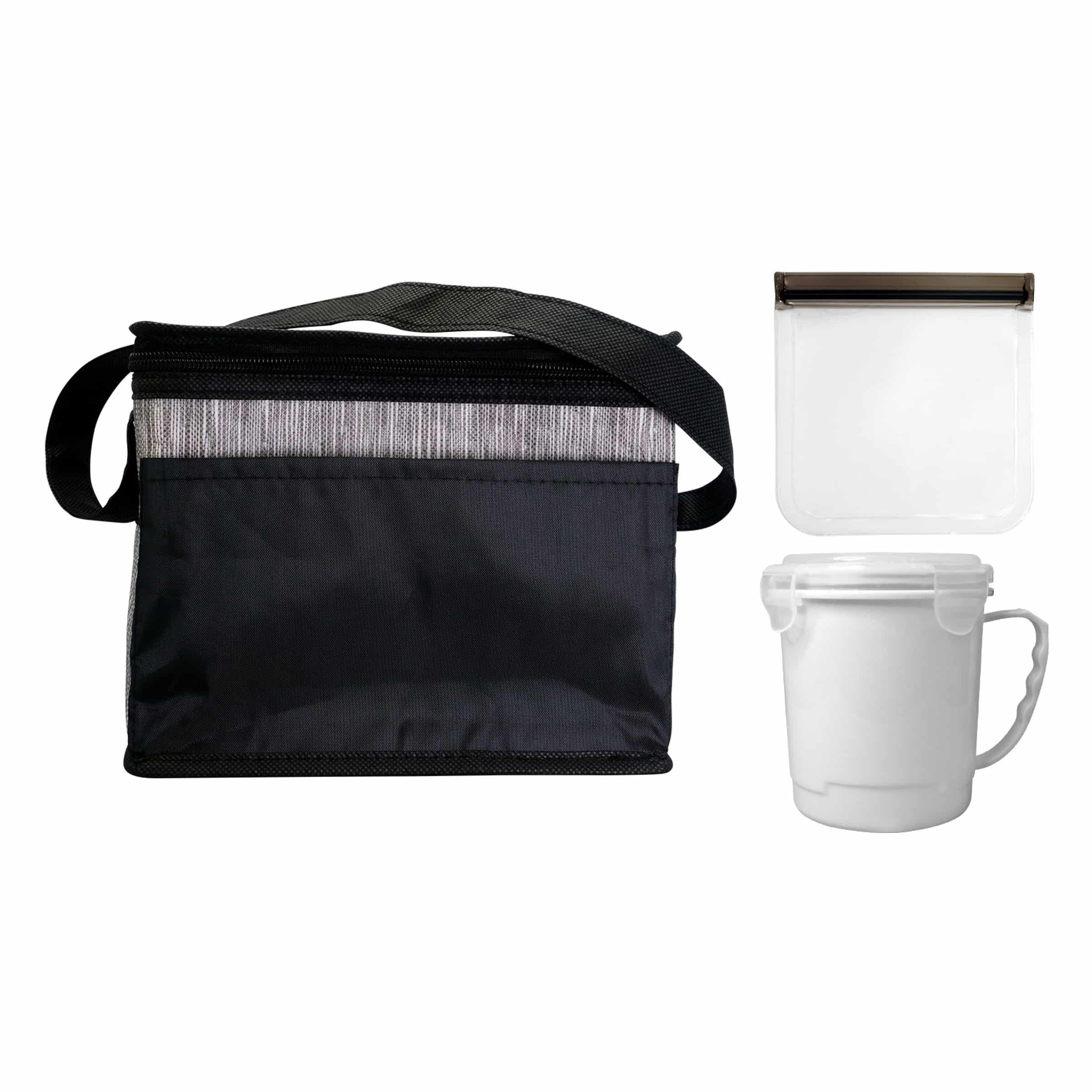 The sleek Black Graph Cooler Bag features a convenient full top opening for easy access. The Soup Mug is designed with a comfortable handle for on-the-go enjoyment. Keep your sandwiches fresh and secure in the Reusable Sandwich Bag, complete with a reliable zip closure. Complies with FDA, Prop 65. 8″ L x 7″ H x 6″ W
