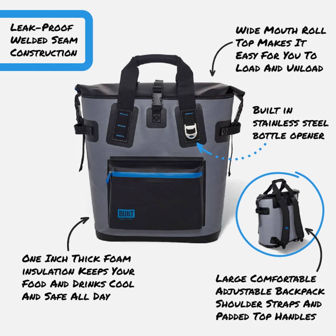 The BUILT® Welded Cooler Backpack is the perfect soft cooler to bring to picnics, barbecues, or camping. Made from tough shell fabric with a high-strength 1000 denier polyester core with double TPU coating , this portable cooler is highly resistant to puncture and abrasion. The durable polyester fabric is leak-proof, and the bag is insulated, keeping cold for days. It can hold up to 32 pounds of ice, or 36 cans plus ice. Features:- Wide mouth roll top makes it easy to load and unload- Leak-proof welded seam construction- Box stitched and reinforced side handles- Large comfortable adjustable shoulder straps and handles- Built in corrosion resistant 18/10 stainless steel bottle opener- Features a front pocket for personal items- BPA-freeProduct Size: 21″ W x 18″ H x 8.5″ D. 21.0″ W x 18.0″ H x 8.5″ D