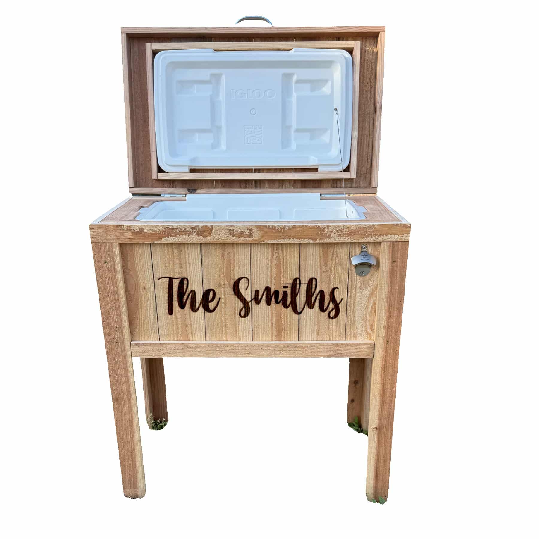 FRIO 48 Cedar Cooler includes a 48 Qt Igloo® Cooler nested inside with hand cut cedar finished frame with steel handle and hinges. Convenient bottle opener featured on front and easy drain faucet located on the side to make for simple clean up! Cooler ships with legs unassembled; requires simple assembly. Complies with Prop 65. 31.25″ L x 18.75″ W x 35.5″ H