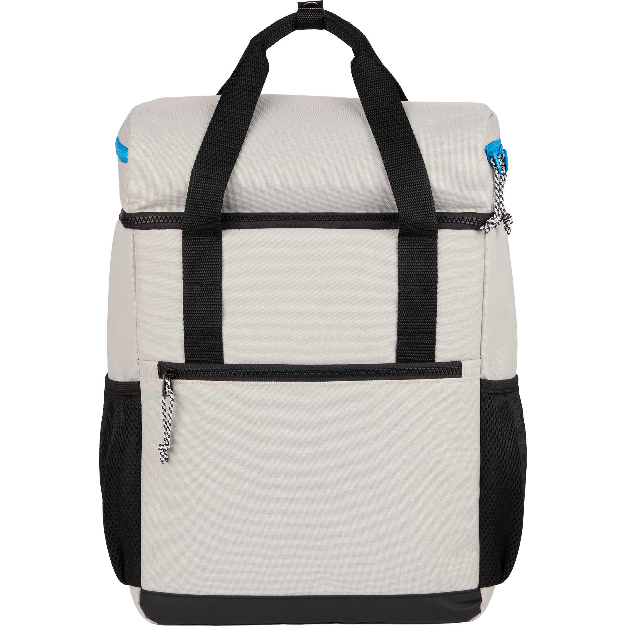 The Glacial RPET Backpack Cooler is the ultimate outdoor adventure cooler! Made with durable recycled materials this backpack cooler features a front zippered pocket for easy, but secure, access to essentials. This cooler also has two water bottle pouches to keep you hydrated. Featuring a sleek, grey PEVA lining this cooler can do it all. Contributes 1% to the Planet! 6.25″ D x 11.75″ W x 15.50″ H