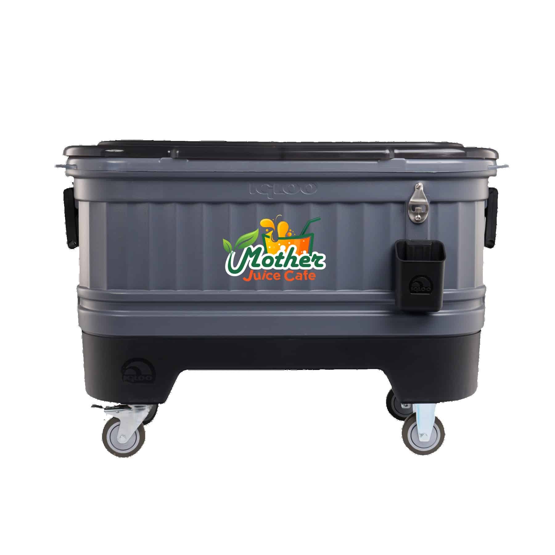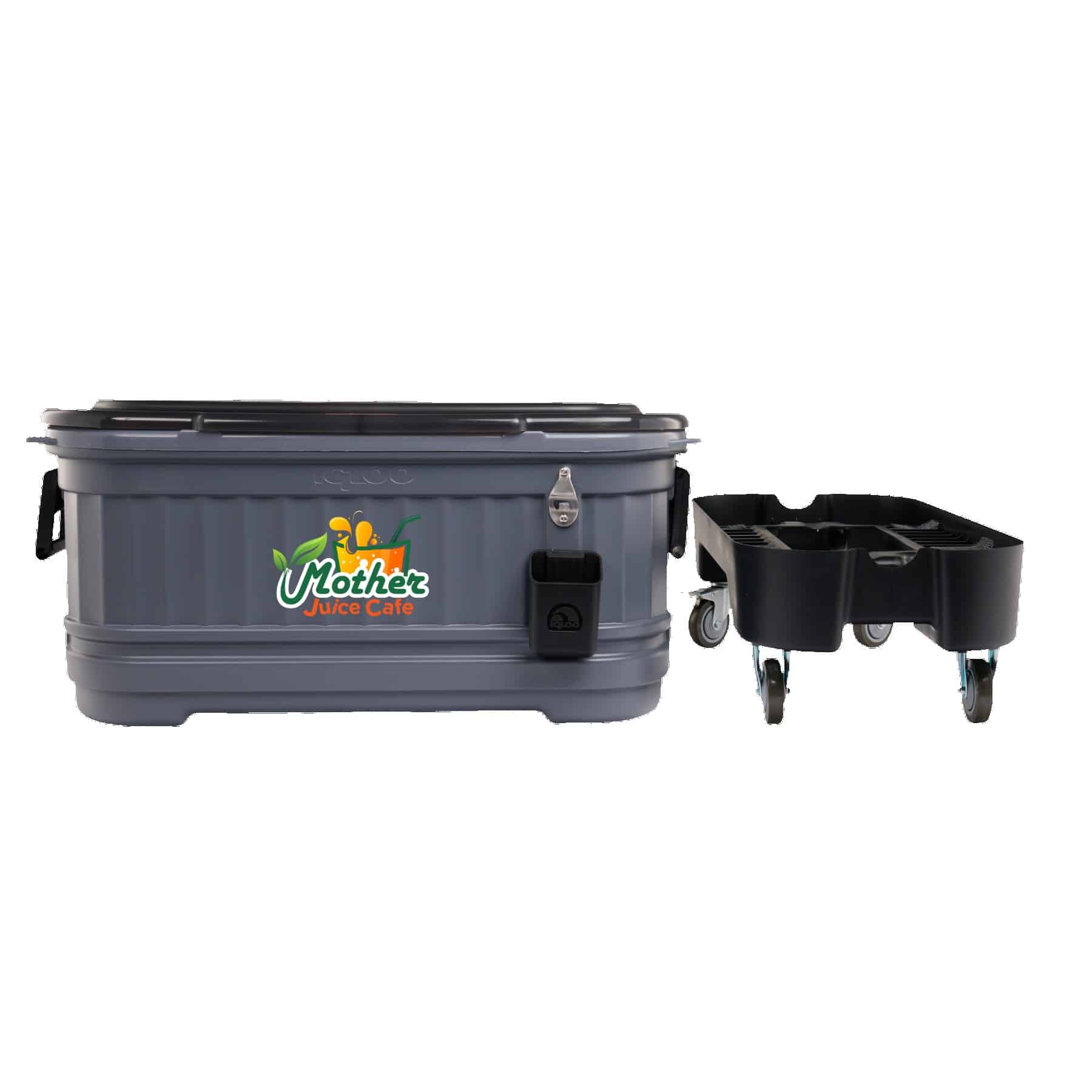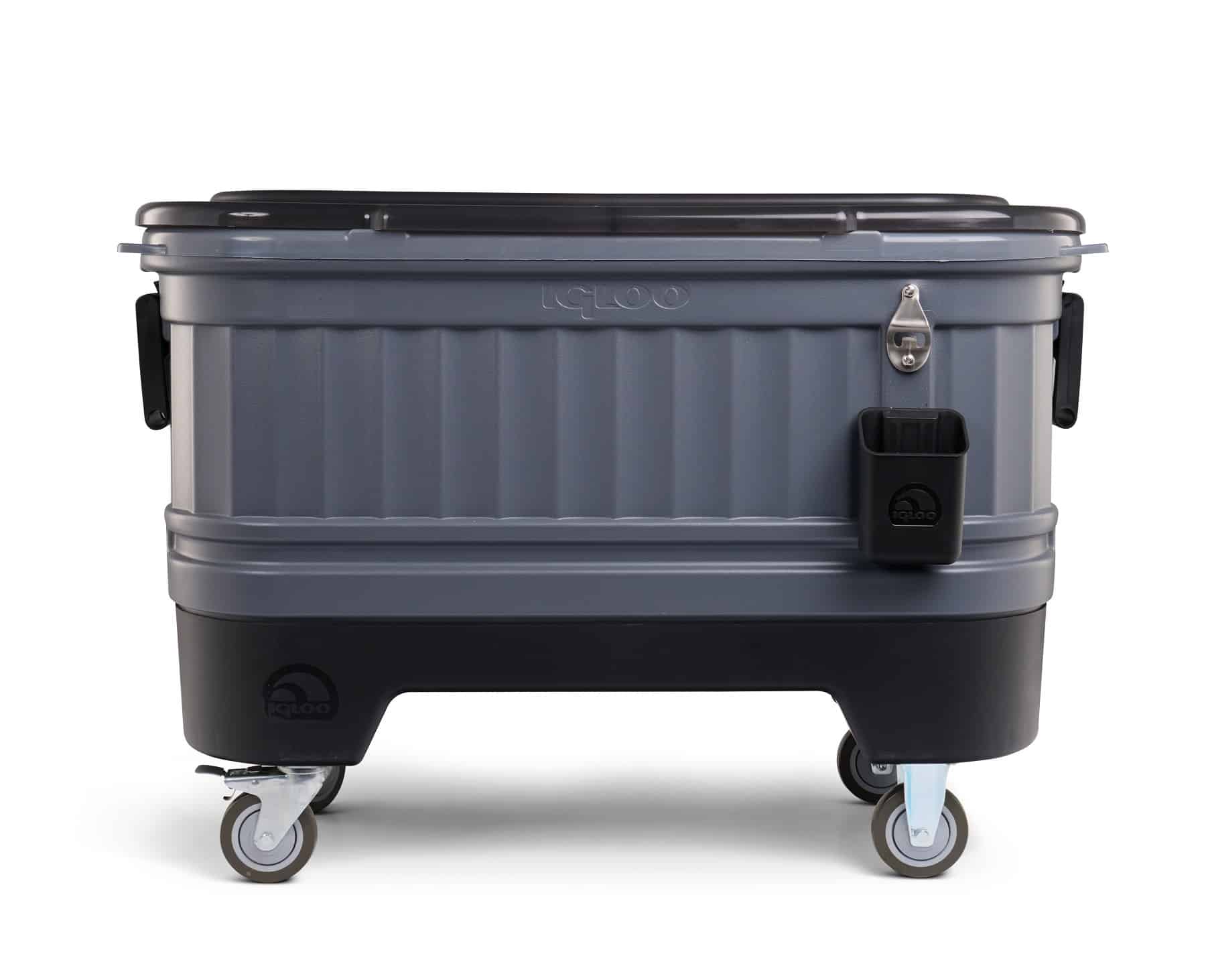 Want to make your next party cooler than the last one? You need the Party Bar — part cooler, part bar cart and entirely fun. With a hefty capacity of 158 cans, this cooler is inspired by the outdoor beer chests found at a traditional Texas icehouse, but with way handier design details like locking casters, bottle opener, dividers and lots more. Its elevated base makes reaching into the cooler very convenient, and it can be removed from the base to use as a conventional ice chest. The removable lid transforms the cooler into an open-air beverage tub. It’s versatile and perfect for the party. Decorate it to reflect your brand with UV DTF or vinyl imprinting. Made in the USA. Complies with Prop 65. 39.1″ L x 21.8″ W x 26.9″ H