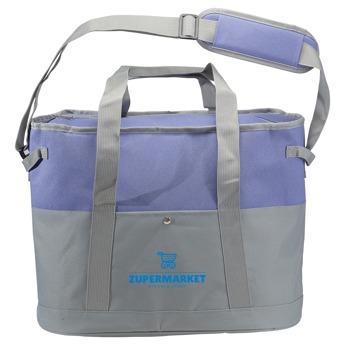 Navigator Cooler Bag is made of two-tone 600D ripstop polyester with foam insulation and lining offers roomy zippered main compartment. Features an adjustable web shoulder strap with sliding comfort pad and side handle loops for easy carrying, front exterior snap pocket holds smaller items securely. Great as a shopping tote or for carrying drinks and snacks. Complies with FDA, Prop 65. 18.5″ L x 10″ W x 13.5″ H