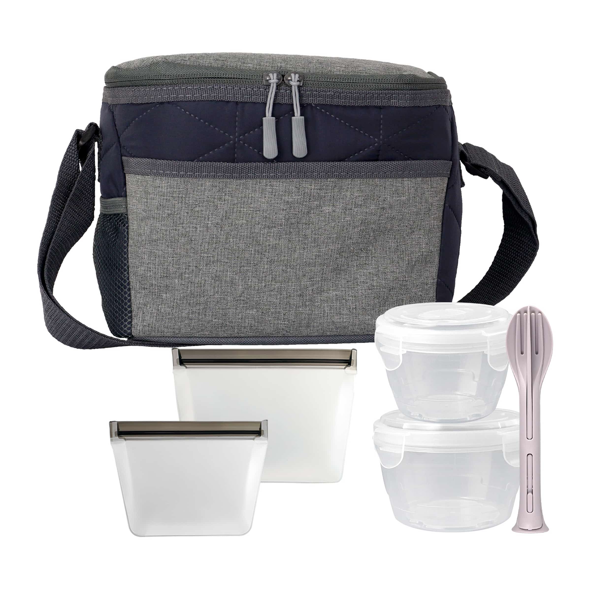 Elevate your lunch experience with our premium accessories: a stylish Quilted Lunch Cooler featuring an adjustable shoulder strap for easy carrying, a sleek White Nesting Locking Lid Bowl Set with convenient vented lids, and a set of Smoke Medium and Large Reusable Food Storage Bags with secure zip closures. Complete your on-the-go dining set with a sleek Fork, Knife, Spoon cutlery set. Enjoy your meals in style and convenience wherever you go. Complies with FDA, Prop 65. 9″ L x 8″ W x 7.5″ H