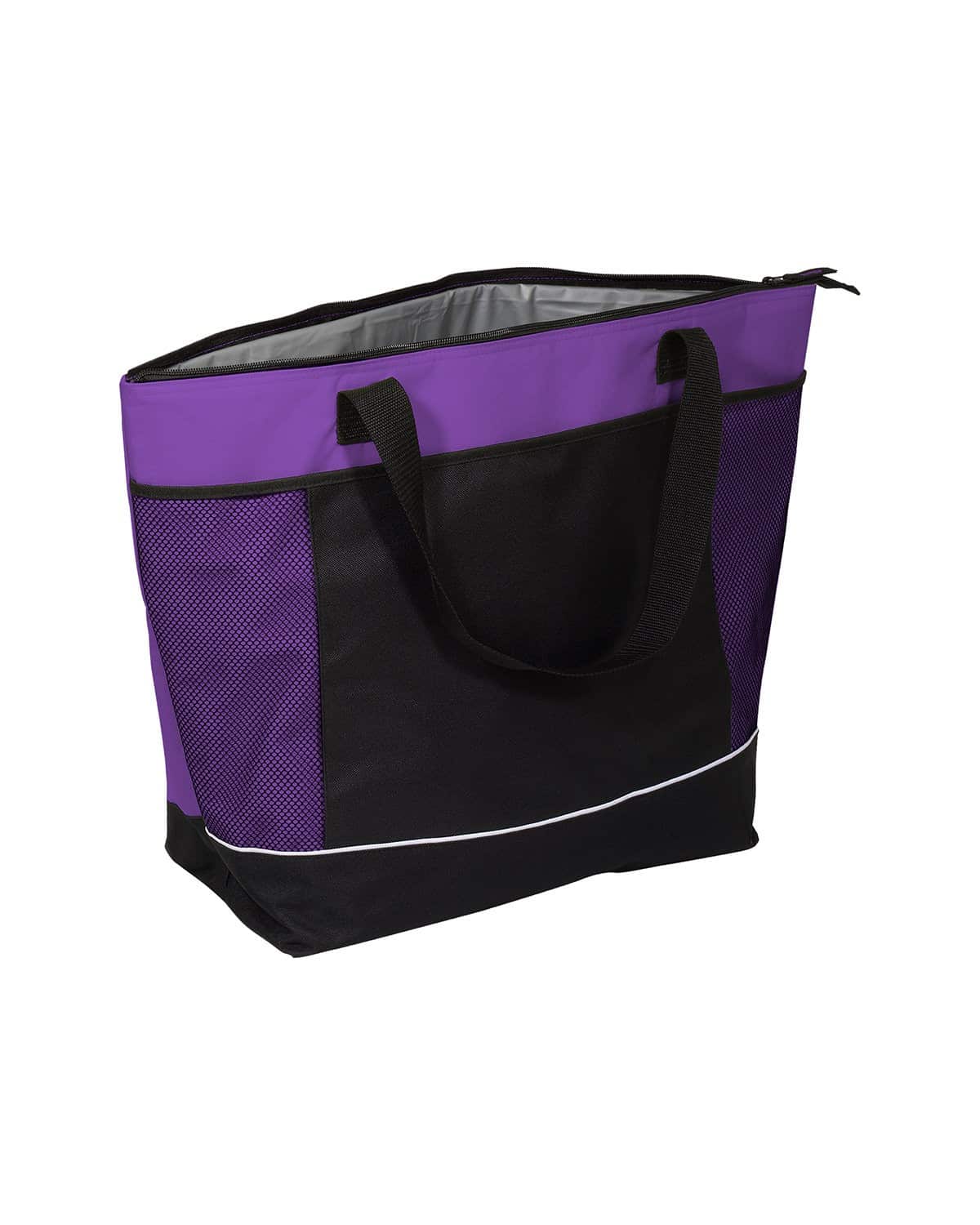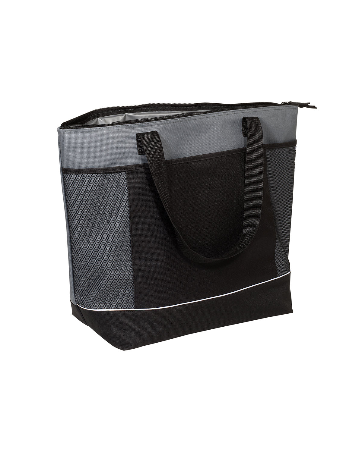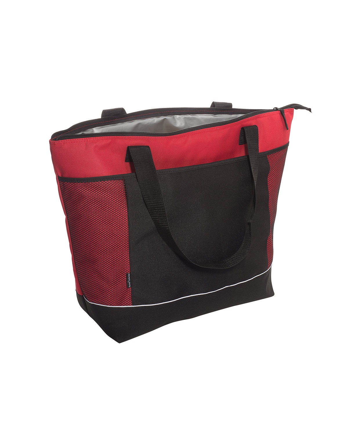 Features large zippered main compartment. Front black pocket with mesh-patterned accent panels and hook and loop fastener closure (approx. 22″w x 10.25″h). Reinforced 26″l x 1.5″w Polyester web handles. Ideal for grocery shopping or a day at the beach, holding up to 30 cans of soda. Hand-wash only, wipe clean with damp cloth. Do not iron. Recommended weight tolerance: 33 lbs. 22.0000″ W x 16.0000″ H x 7.5000″ D