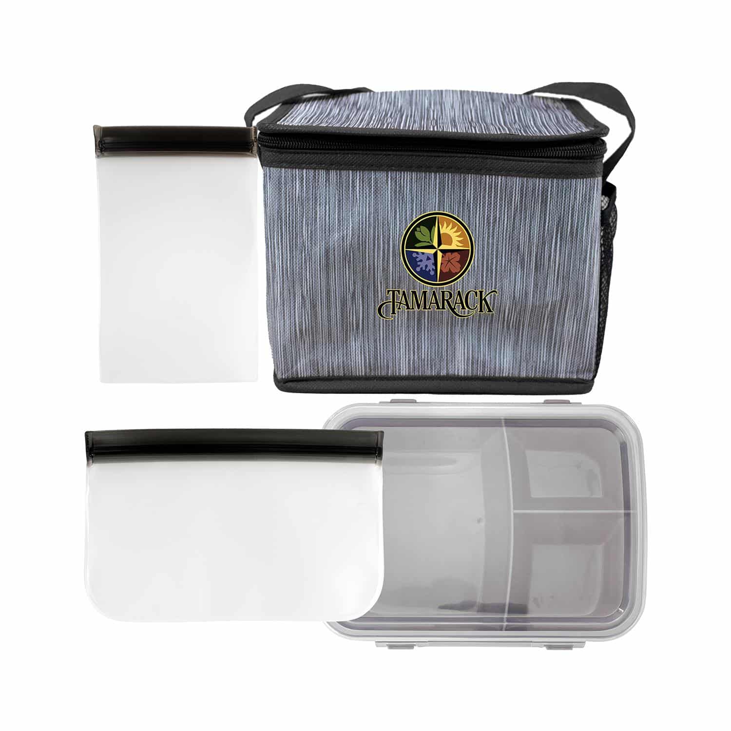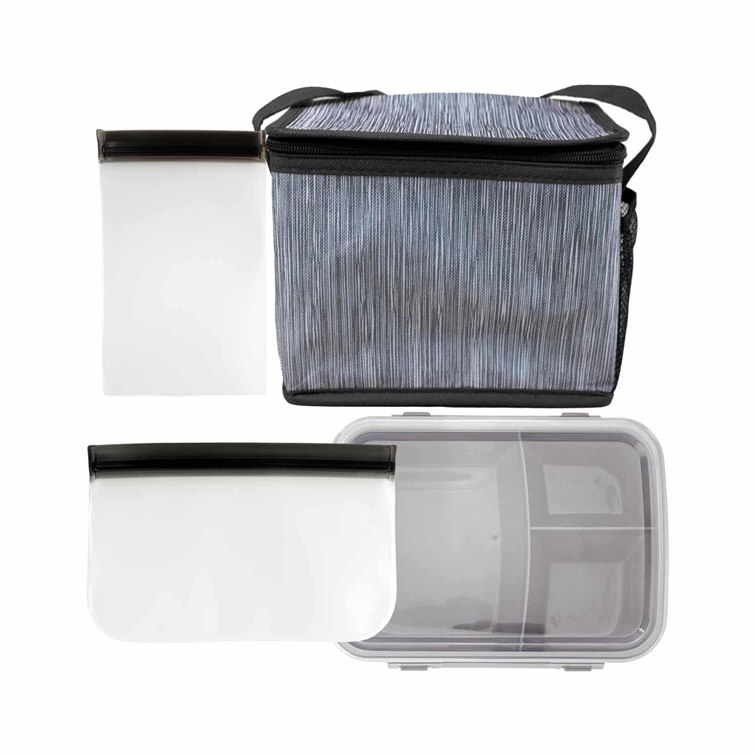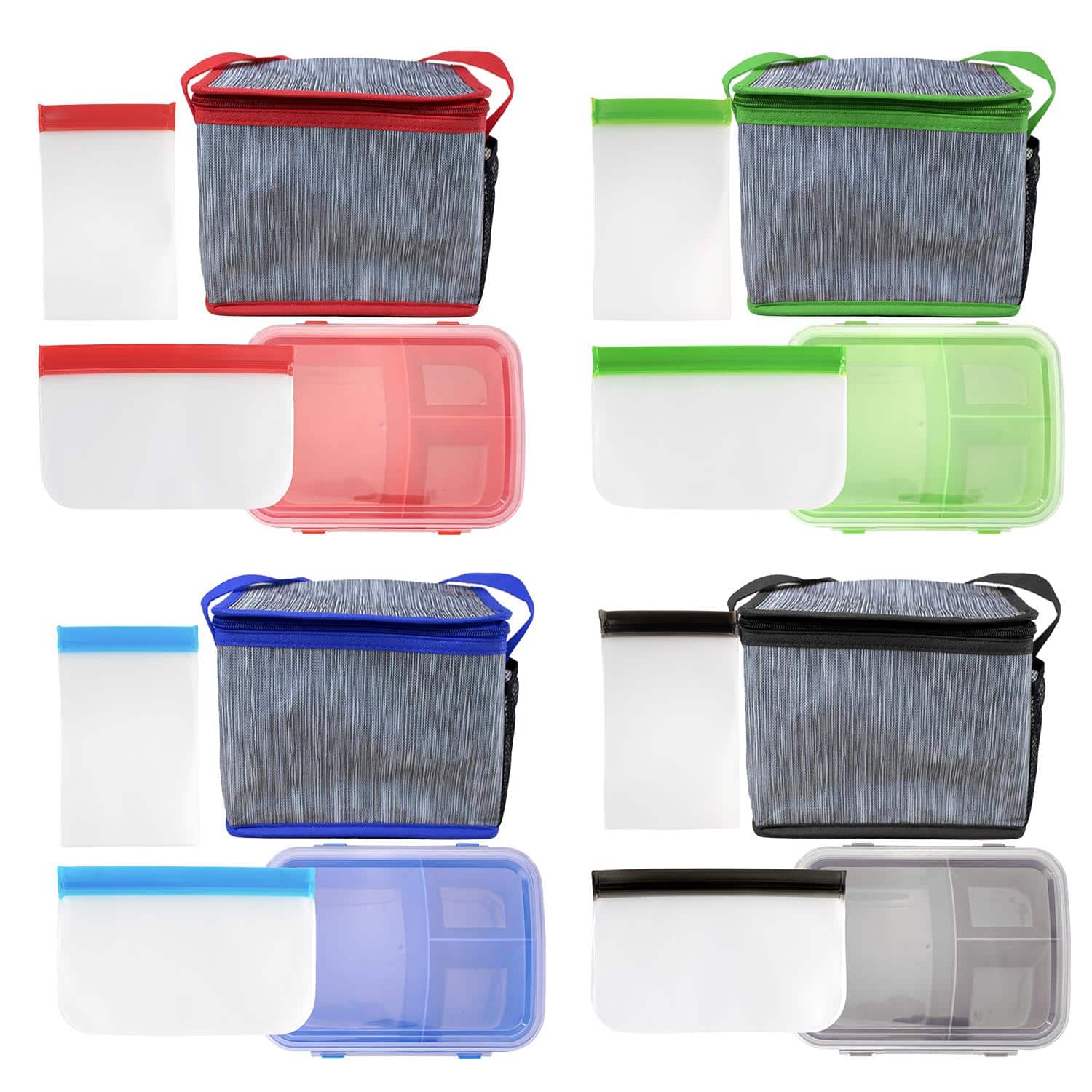 Introducing our eco-friendly Recycled Lunch Cooler, expertly crafted from recycled polyester for a sustainable dining experience. The Lunch To Go Container features a convenient clip top for easy access to your meals on the go. Our Small Reusable Food Storage Bag boasts a secure zip closure to keep your snacks fresh and delicious. And the Snack Reusable Food Storage Bag, also equipped with a zip closure, is perfect for storing your favorite treats. Upgrade your lunch routine with our environmentally conscious and stylish lunch accessories. 8.375″ L x 6.75″ H x 5.5″ W