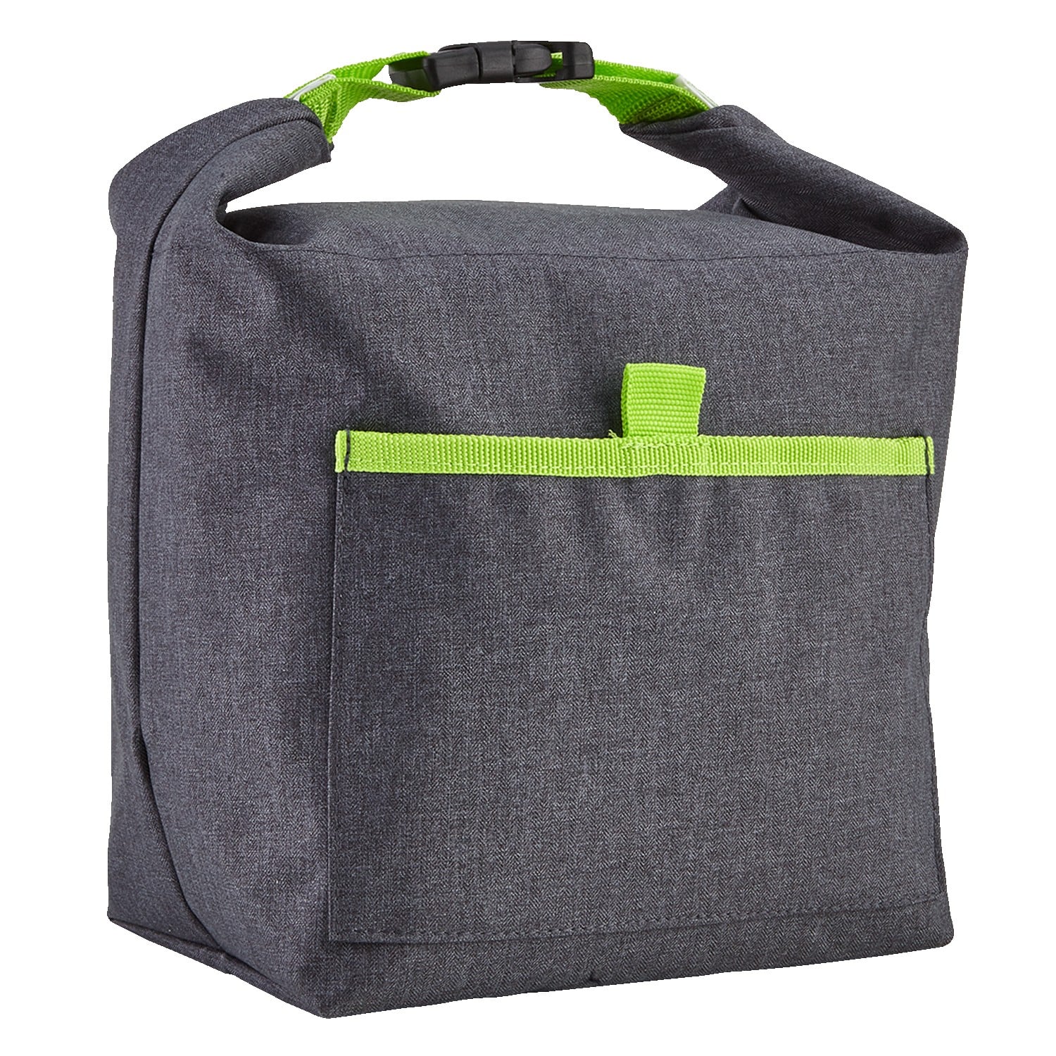 Constructed of 240D heathered grey polyester. Features colorful accents. Roll top down and buckle the closure to secure lunch. Great size front packet for easy storage. Hang from hooks, bikes, racks, backpacks, etc. Great for office, for school, for students, for men, for work. 13″ H x 13″ W x 6″ D