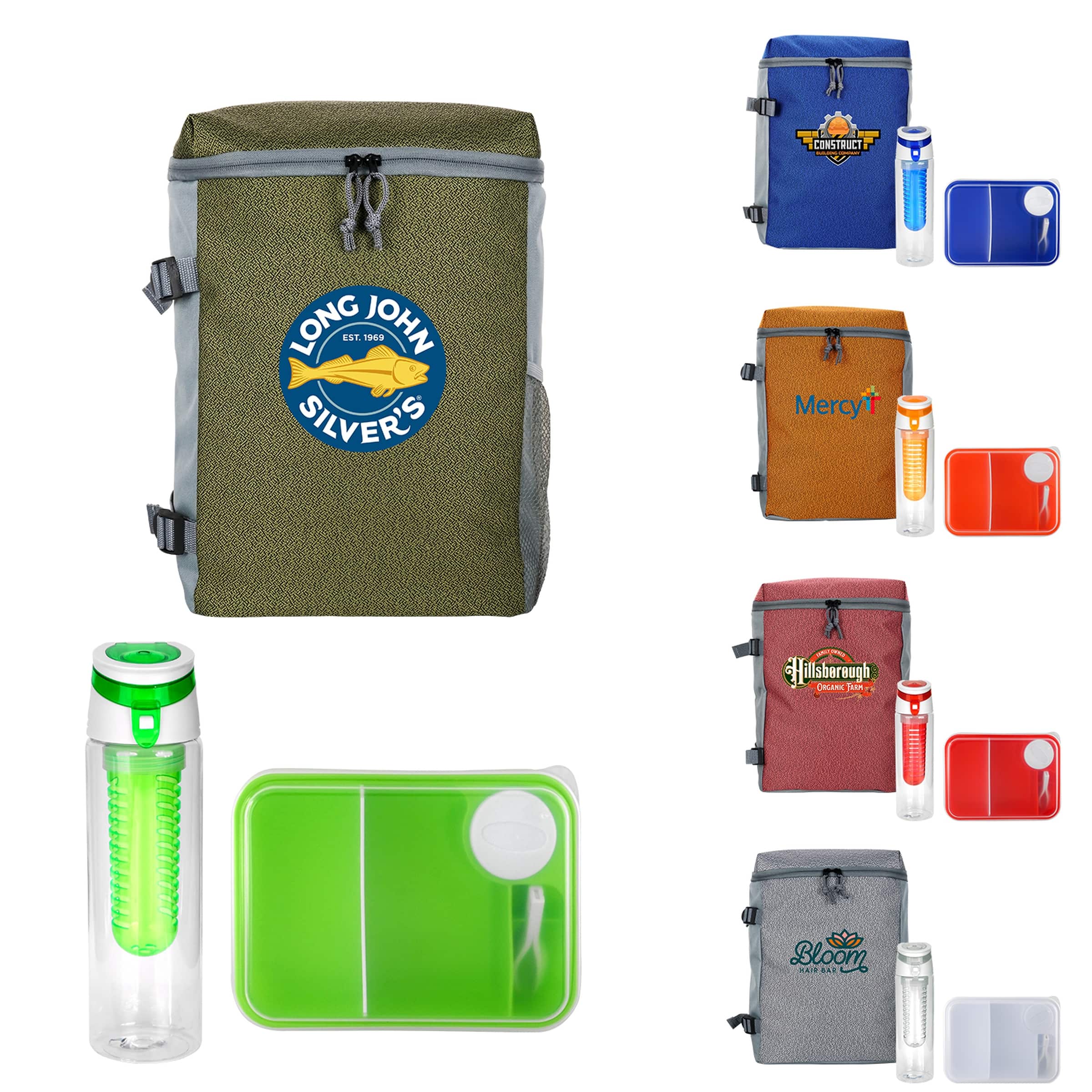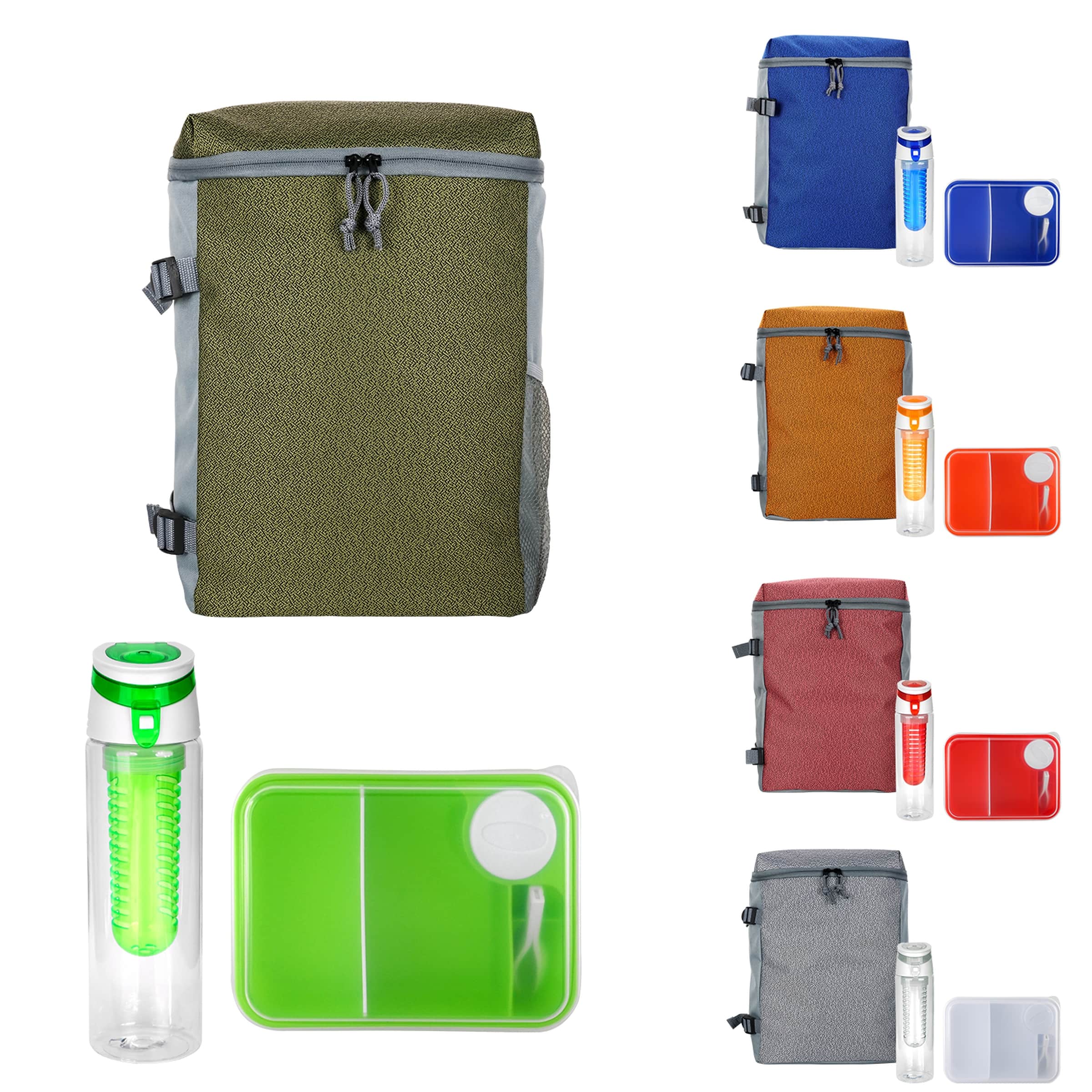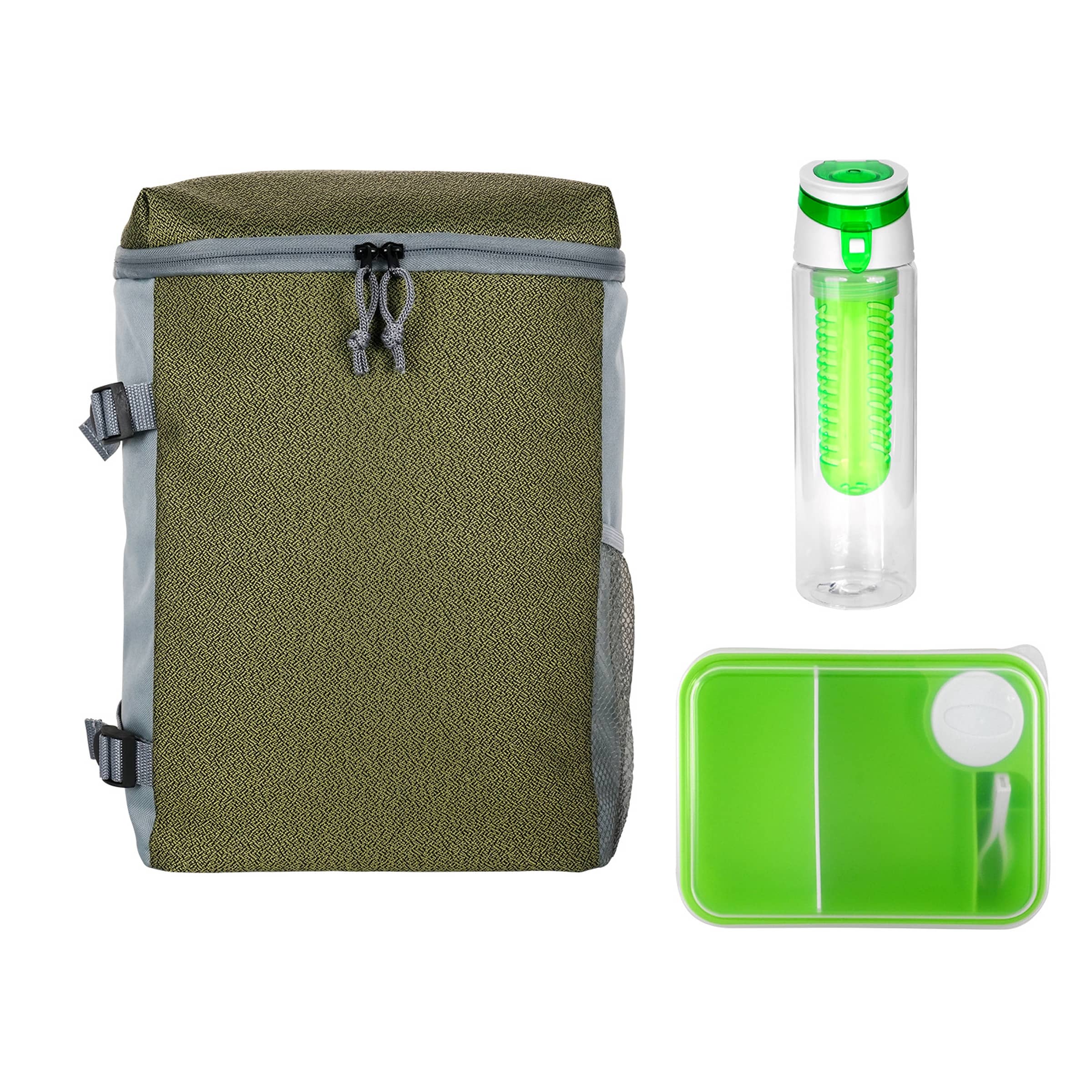 Introducing the sleek Speck Cooler Backpack featuring adjustable straps for ultimate comfort on the go. The On-The-Go Lunch Container comes fully equipped with convenient plastic utensils, making meal prep a breeze. Stay hydrated in style with the trendy 24 oz. Recycled Bottle, complete with a fruit infuser to add a burst of flavor to your beverages. Elevate your daily routine with these must-have accessories designed to make your life easier and more stylish. Complies with FDA, Prop 65. 10″ L x 13″ H x 5.75″ W