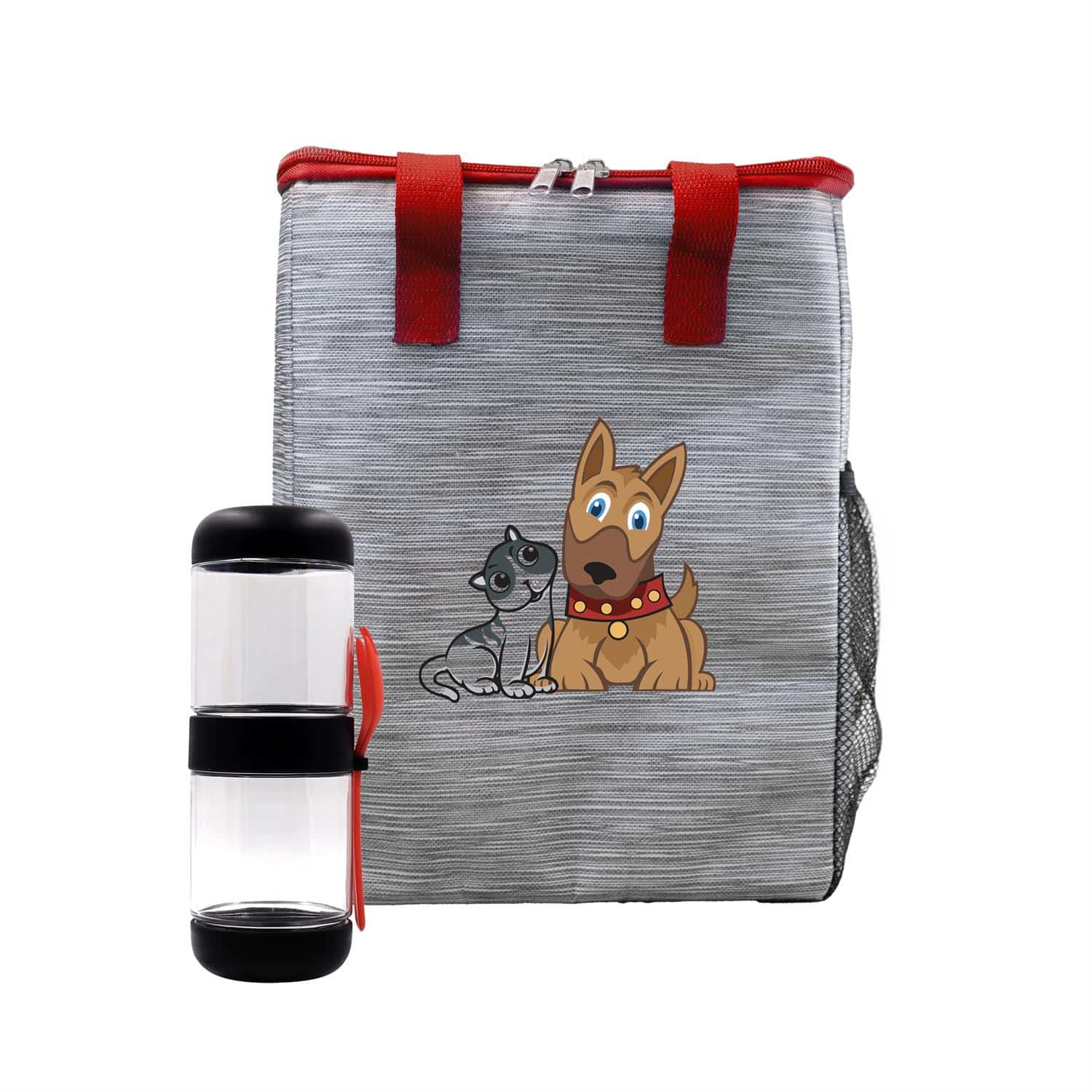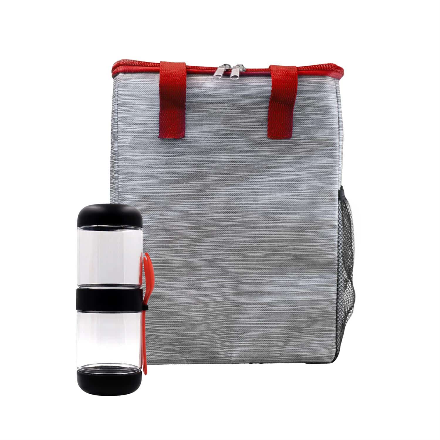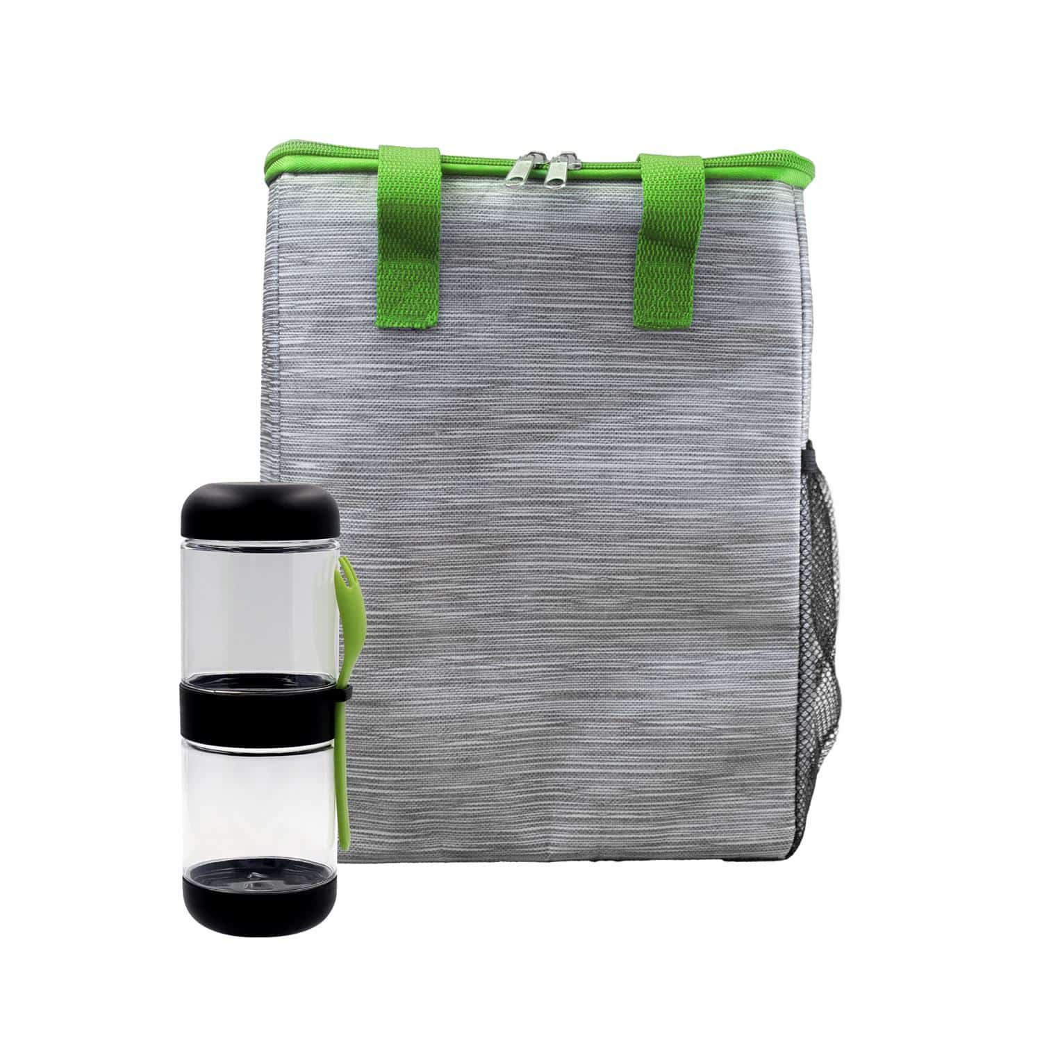Recycled Tote Cooler with colorful accents. Snack Stackers with colorful spoon/fork combo. Complies with FDA, Prop 65. 9.75″ L x 12″ H x 6″ W