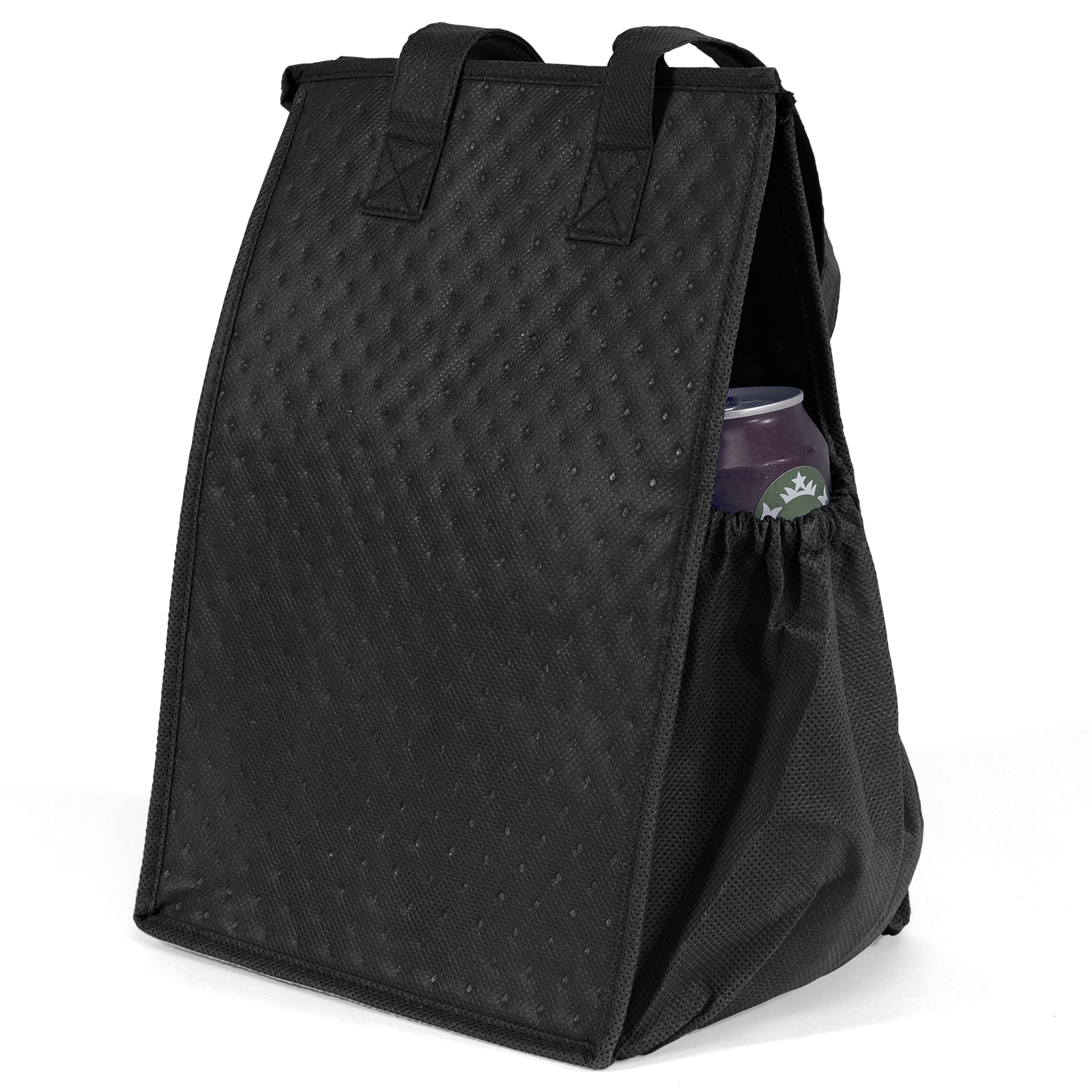 The Therm-O Snack™ is insulated to keep contents hot or cold. This lunch-size tote is made with a durable 238 combined GSM premium non-woven exterior, thermal foil interior, reinforced handles, zippered closure, and plastic bottom insert. Handles measure 1″W x 18″ long. 8″ W x 7″ D x 12″ H