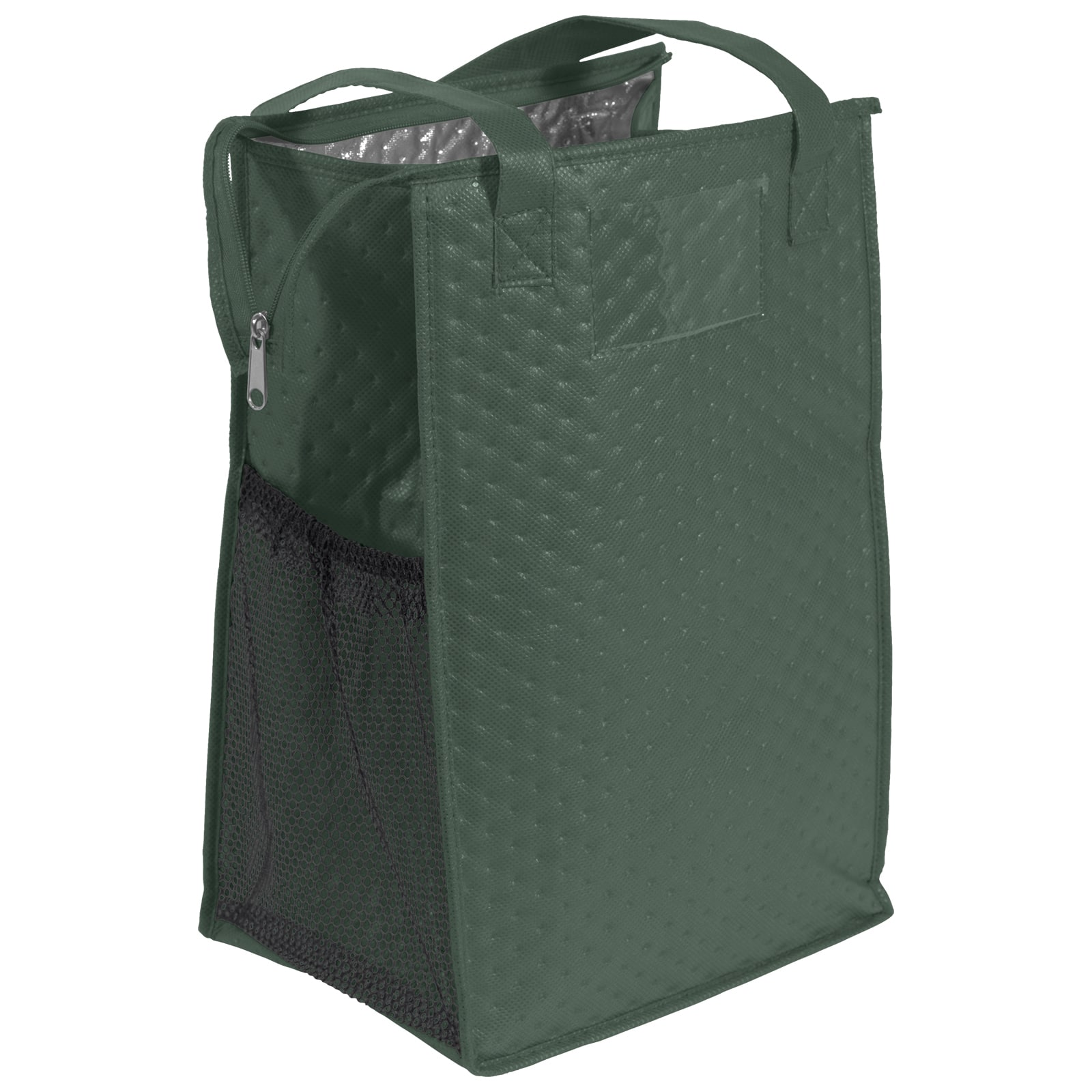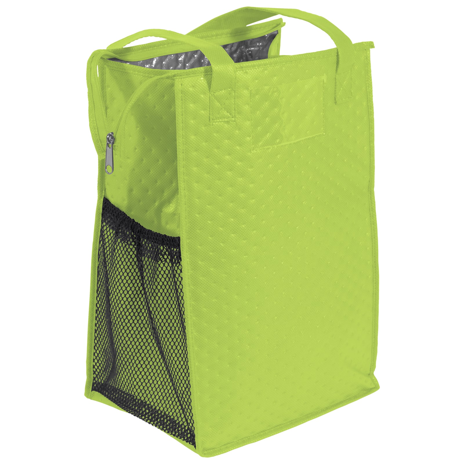 The Therm-O Super Snack™ is insulated to keep contents hot or cold. This lunch-size tote is made with a durable 238 combined GSM premium non-woven exterior, thermal foil interior, reinforced handles, zippered closure, and plastic bottom insert. Handles measure 1″W x 20″ long. 9″ W x 7″ D x 14″ H