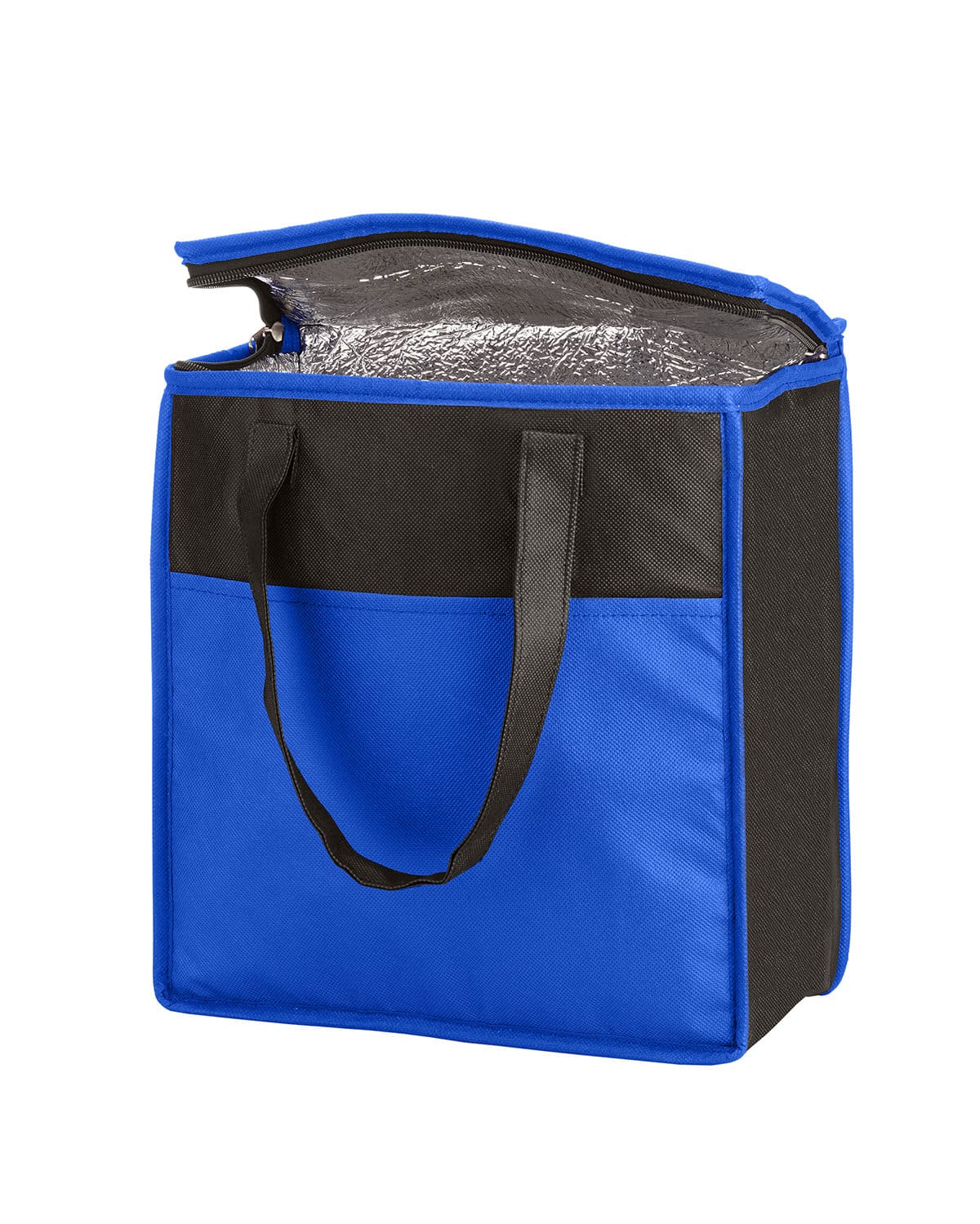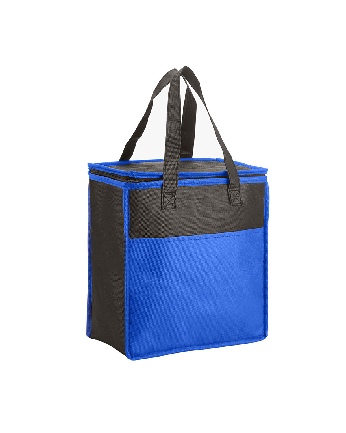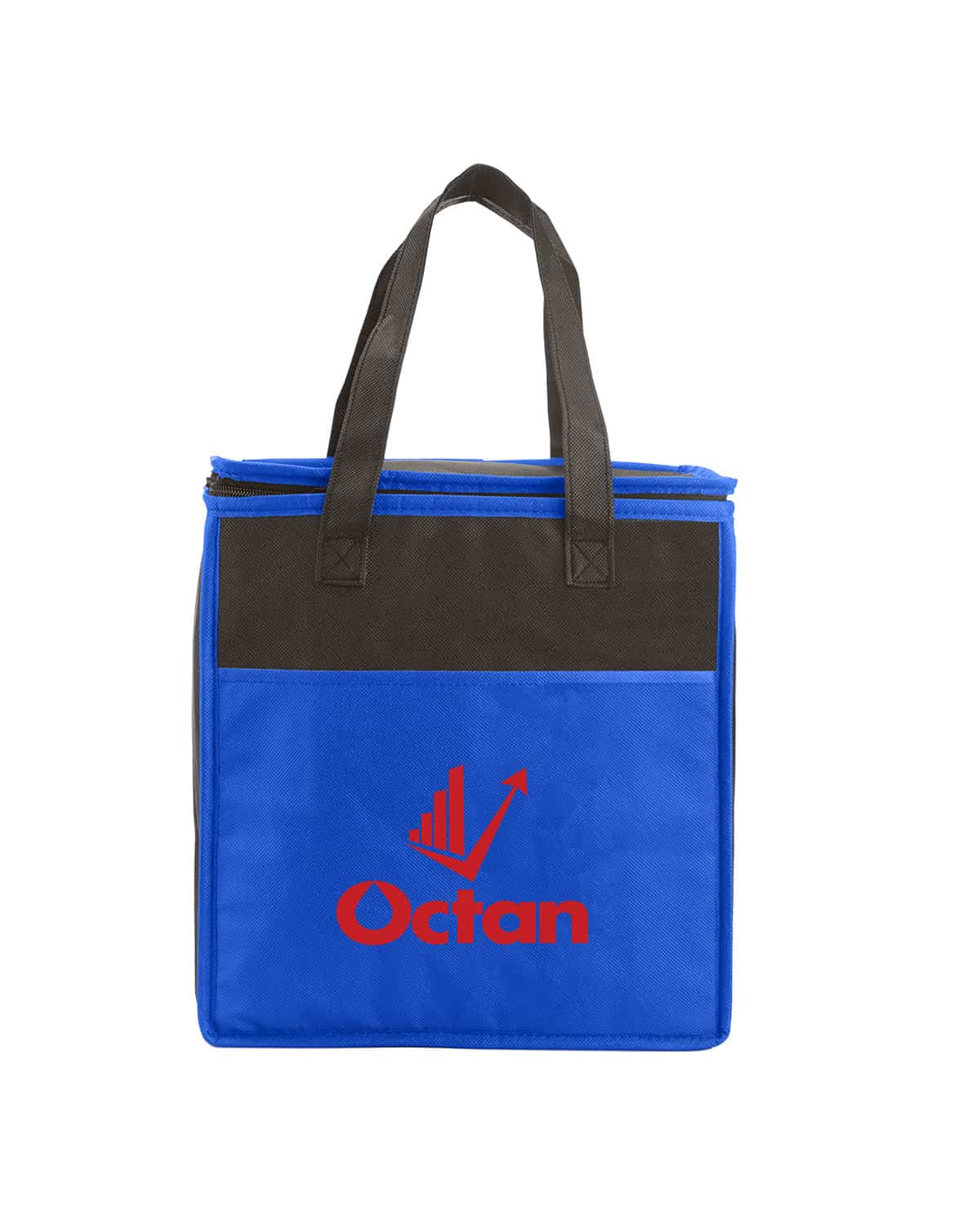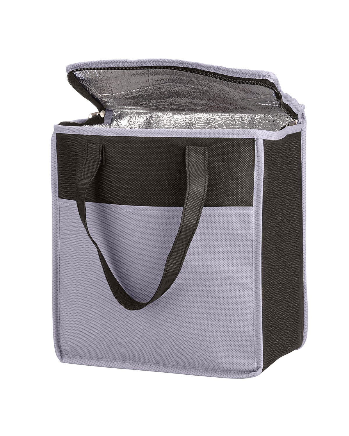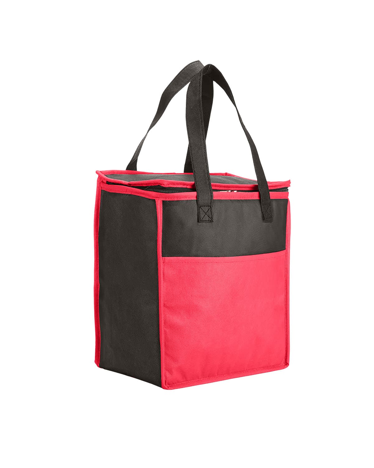 Insulated grocery tote made of durable 80 GSM Non-woven Polypropylene exterior with thermal food-safe aluminum foil liner. Features a two-tone color design with color body and black accent top, front pocket, back panel and handles. Front open pocket and zipper closure. Features flat top. Reinforced 19″l handles. Holds approx. 20 cans of your favorite beverage. Recommended weight tolerance: 11 lbs. 10.7500″ W x 11.5000″ H x 6.0000″ D