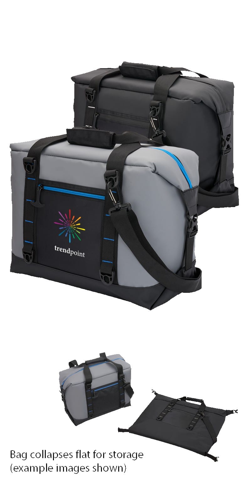 Collapsible size measures 18H x 21W Durable, collapsible 20 can cooler is designed to transition easily from a cube shape to flat for economical shipping and storage Leak-resistant heat-sealed liner Exterior includes 2 side buckles, simply unfasten and flatten for convenient storage Hook and loop padded closure on handles Adjustable and removable padded shoulder strap Rugged waterproof matte 55C PVC Mesh Tarpaulin exterior, 38C PVC lining, and an 840D pocket Featuring thick 10mm foam. 8.5″ D x 17.5″ W x 11.5″ H