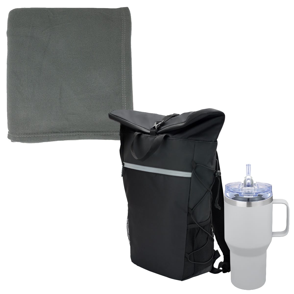 Backpack cooler made of 55C PVC Mesh Tarpaulin, 38C PVC lining, 210D/PU insulation, and 300D/PU pocket with a leak-resistant heat-sealed liner Features the Urban Peak 24 Can Roll Top Backpack Cooler (CB172), Promo Fleece Blanket (PROMOFLSL), and 30 oz Urban Peak Apex Ridge Vacuum Travel Mug (SL173PR) Promo fleece blanket is made of 100% polyester, available in 5 colors 1-year limited warranty on all Urban Peak products Travel mug features a push-on AS plastic flip top with Tritan snap-locking. 6″ D x 16″ W x 21″ H