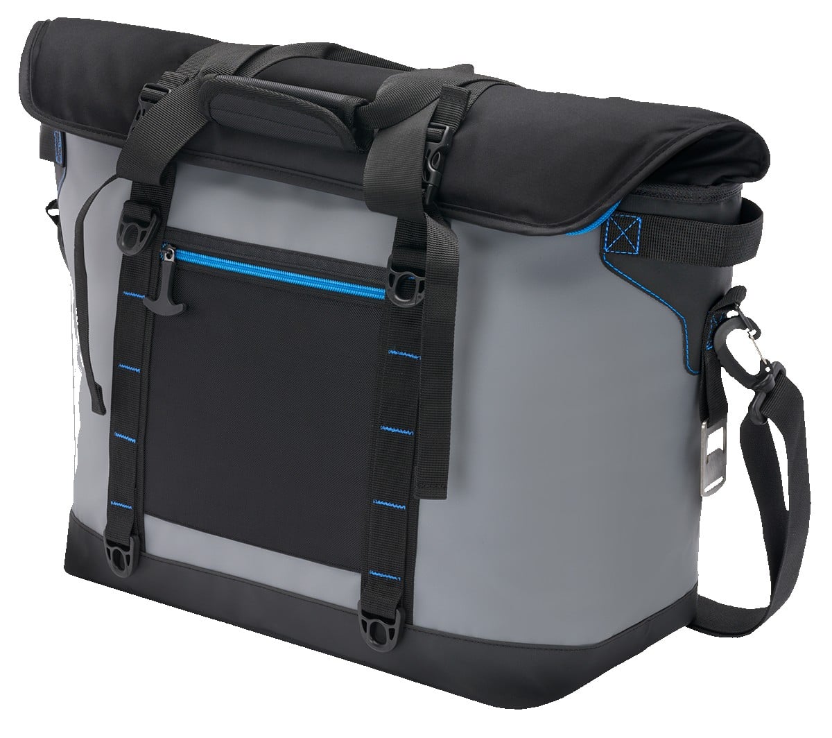 Features durable zippers with glove friendly zipper pulls, bold color stitch trim, front zippered pocket, front side daisy chains, attachment buckles, side carry handles, and an attached Stainless Steel bottle opener Durable top-loading 38 can waterproof tote bag/cooler featuring extra thick foam insulation Hook and loop closure on padded handles Leak-resistant heat-sealed liner Wide opening, zippered top allows for quick accessibility and has two adjustable buckles 1-year limited warranty Made. 8″ D x 17″ W x 17″ H